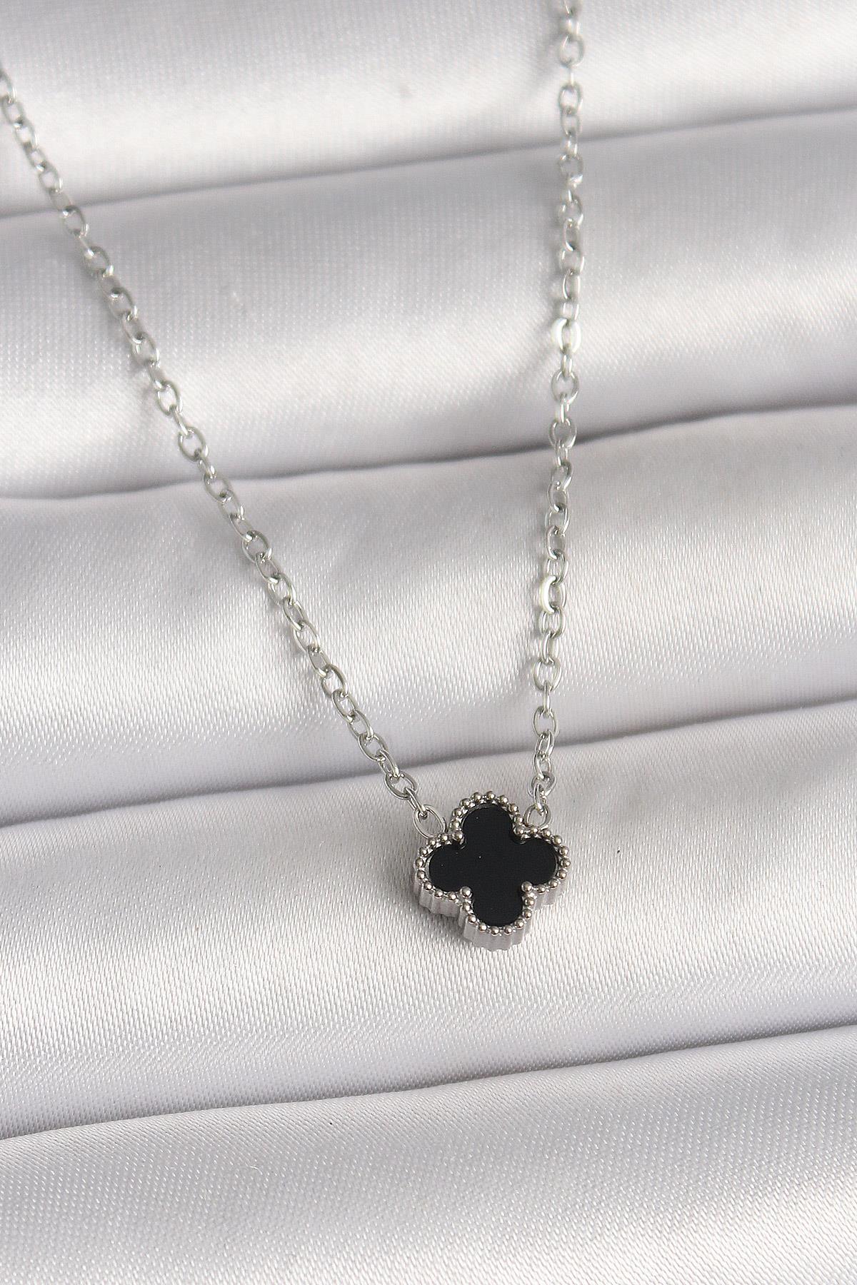316L Çelik Gümüş Renk Siyah Yonca Model Kadın Kolye